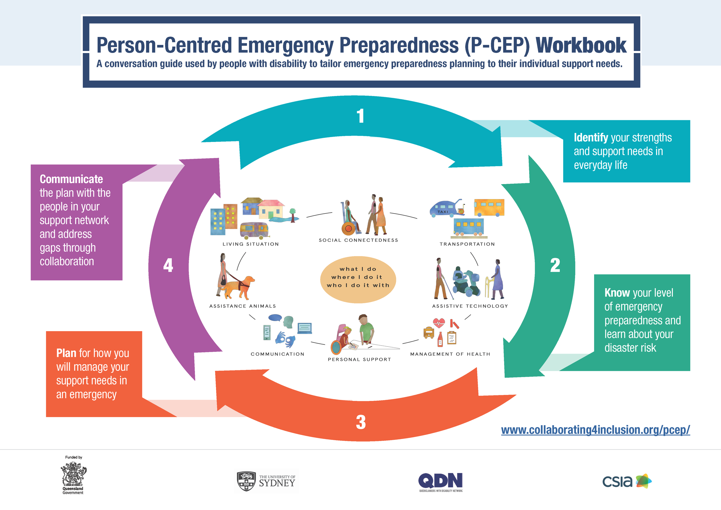 Come along to our two day workshops (in-person and online) where trained facilitators from Resilient Kurilpa and Metro South Health will support you to tailor your own personal emergency plan for floods and other emergencies. We’ll guide you through the four-part Person-Centred Emergency Preparedness (P-CEP) process, which includes: