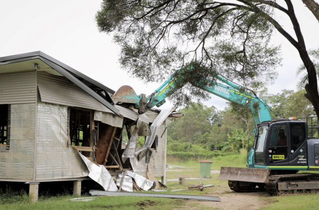 Image: High flood risk home in Goodna is demolished a part of the Resilient Homes Fund, 2022. Credit: West Bremer Radio.