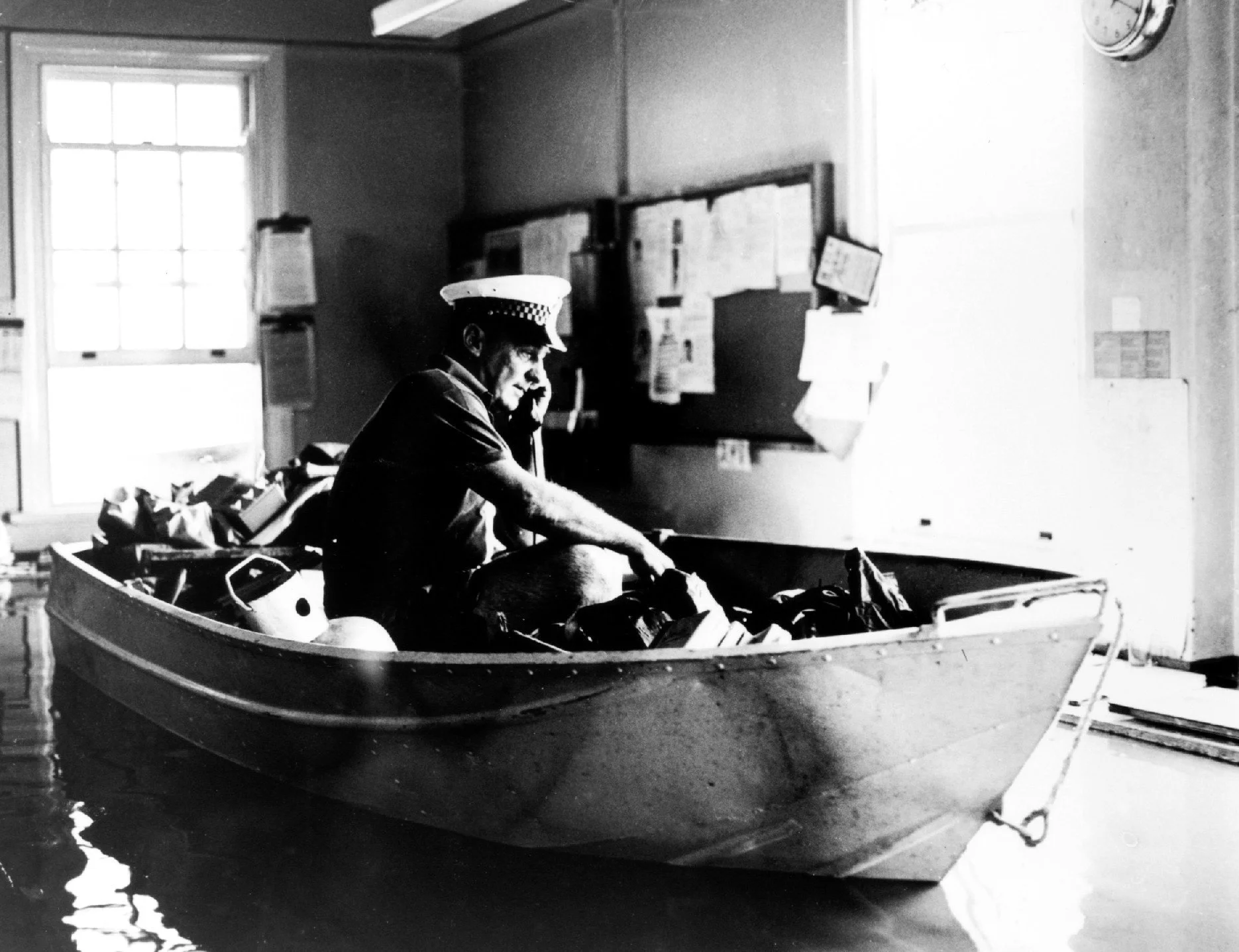 Image: Police Sergeant working in a dinghy in the flooded Police Station at Petrie Bight, under the Story Bridge, 1974. Courtesy: Police Museum Image PM1033.