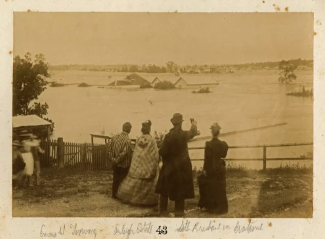 Image: Looking down at flooded Emma Street, now Glenn Road, Toowong during the 1893 flood. Across the river in the distance are Hill End and Orleigh Estates. (Fryer Library, University of Queensland).