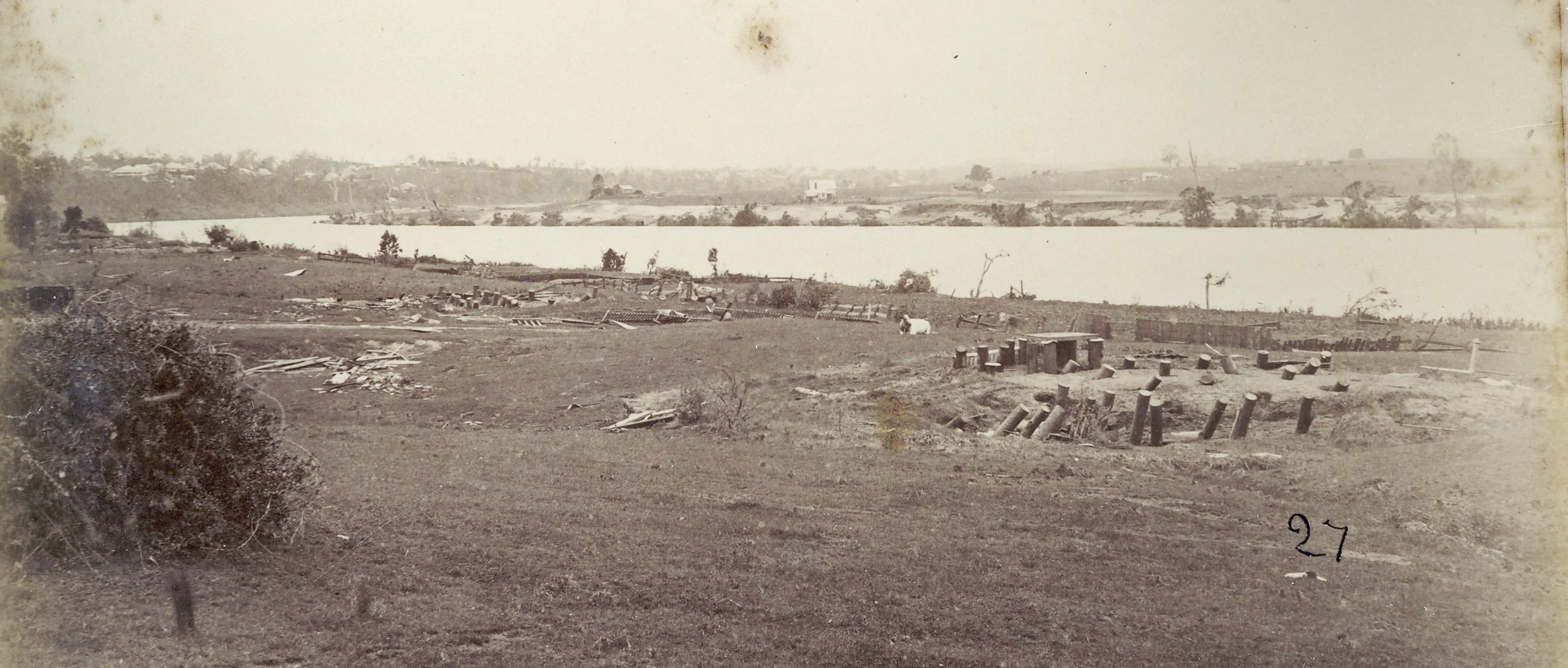 Image: Orleigh Estate after the 1893 flood showing the scant scattered remains of a row of houses.. (Fryer Library, University of Queensland.