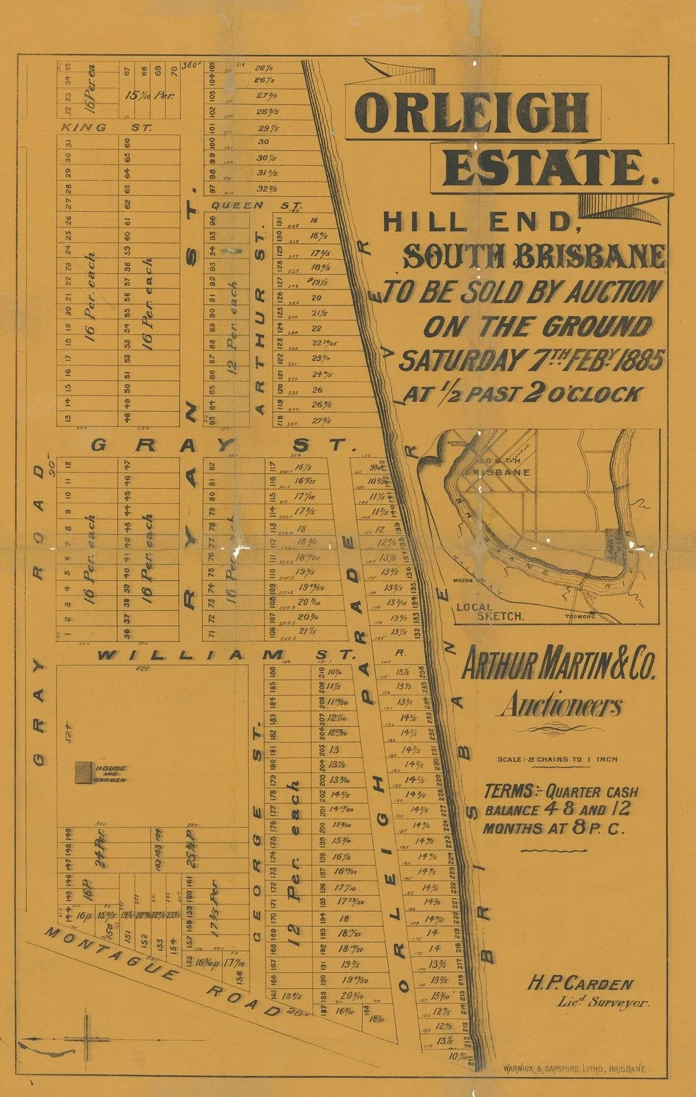 “Orleigh Estate” went on sale in February of 1885. As was common at the time, the estate took its name from the original house and property. For other examples, see my posts The Hazelwood Estate, Highgate Hill 1885 and The Blakeneys of Highgate Hill