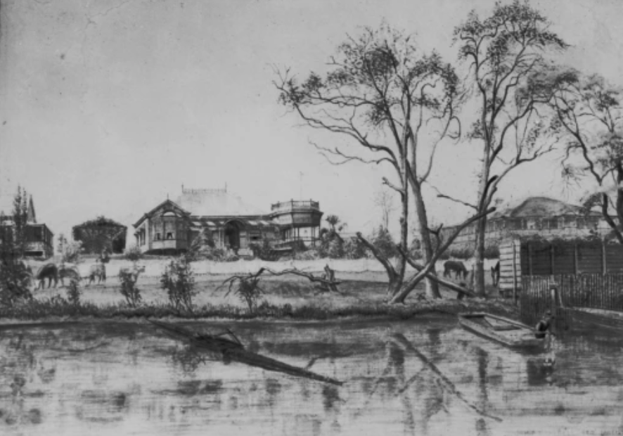 Image: Hill End Estate river side houses during the 1890 flood, viewed from Toowong. (State Library of Queensland).