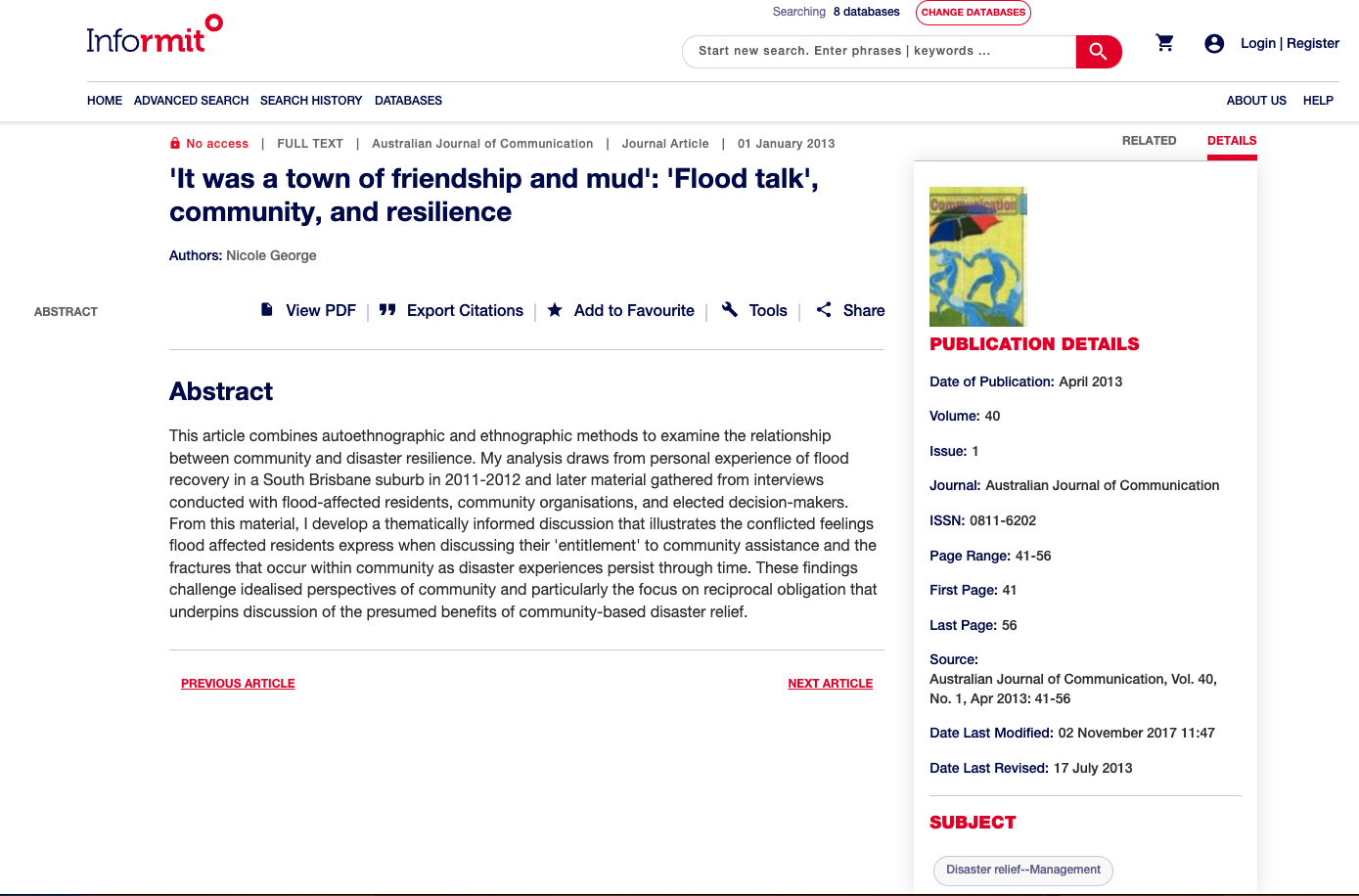This article combines autoethnographic and ethnographic methods to examine the relationship between community and disaster resilience. My analysis draws from personal experience of flood recovery in a South Brisbane suburb in 2011-2012…